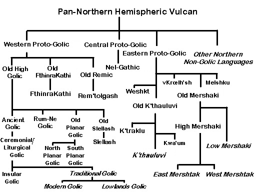 Linguistic family tree of "Northern Hemisphere" languages on Vulcan,